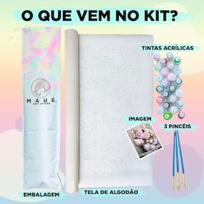 O Kit Pintura Terapêutica contém: - 01 tela em algodão 40x50cm numerada original Maue Art Store; - 01 Jogo de tintas acrílicas numeradas; - 03 pincéis; - 01 folha de papel numerada impressa; - 01 Guia para as tintas; - Adesivos numerados;