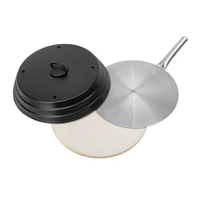 Kit Pizza ideal para fazer pizzas em churrasqueiras: Com Pedra redonda refratária, Pá em alumínio, Abafador Preto. Qualidade e praticidade.