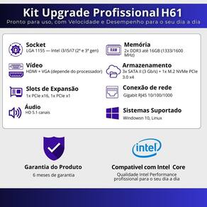 Kit pl mãe h61 + processador i5 3470 + cooler Este kit inclui: Processador intel para desempenho eficiente em multitarefas; Placa-mãe estável e confiável; Cooler incluso para melhor refrigeração;