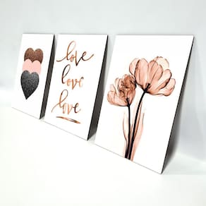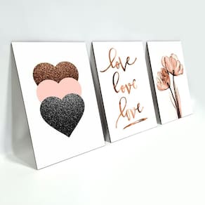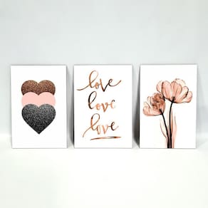 Kit Placas Quadros Decorativos 3 Peças Mdf - Love, Love, Love Produzido em MDF 3mm com aplicação de adesivo com impressão em alta resolução e fitas dupla face no verso para facilitar a fixação. Quadros decorativos são tendências e uma excelente idéia para decorar ambientes de forma econômica e bonita, elas são leves e extremamente fáceis de instalar; além de servir para a decoração de qualquer ambiente, desde estabelecimentos como restaurantes, bares, lojas até quartos, sala, área de lazer, churrasqueira, dando um toque especial em sua decoração. Cada quadro tem a medida de: Largura: 19,0cm Altura: 28,5cm Espessura: 0,3cm Pode ser deixado um espaçamento de até 3cm entre cada quadro no momento da instalação. Ean: 7898928707438