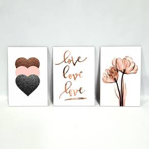 Kit Placas Quadros Decorativos 3 Peças Mdf - Love, Love, Love Produzido em MDF 3mm com aplicação de adesivo com impressão em alta resolução e fitas dupla face no verso para facilitar a fixação. Quadros decorativos são tendências e uma excelente idéia para decorar ambientes de forma econômica e bonita, elas são leves e extremamente fáceis de instalar; além de servir para a decoração de qualquer ambiente, desde estabelecimentos como restaurantes, bares, lojas até quartos, sala, área de lazer, churrasqueira, dando um toque especial em sua decoração. Cada quadro tem a medida de: Largura: 19,0cm Altura: 28,5cm Espessura: 0,3cm Pode ser deixado um espaçamento de até 3cm entre cada quadro no momento da instalação. Ean: 7898928707438