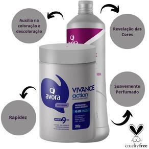 O Avora Vivance Action Pó Descolorante é indicado para realizar todos os tipos de descoloração, proporcionando um clareamento ultrarrápido e uniforme nos cabelos. Sua fórmula exclusiva é menos agressiva e pode ser usada em todas as técnicas profissionais, como Clareamento Total, Mechas, Reflexos, Ballayages e Luzes. Contém Proteínas do Leite de Soja, que devolvem força e vitalidade aos fios durante o processo de descoloração, evitando a formação de pontas duplas e conferindo brilho, maciez e suavidade aos cabelos.