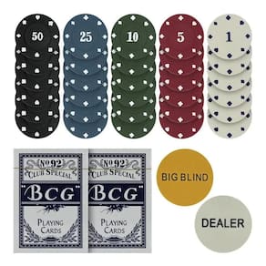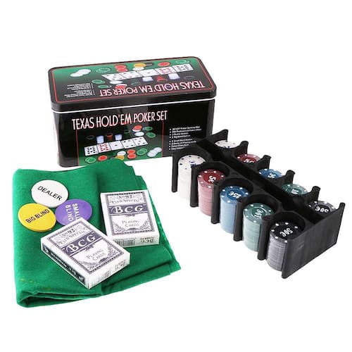 É o mais popular de uma classe de jogos nos quais os jogadores com as cartas total ou parcialmente escondidas fazem apostas para um monte central, após o que o resultante das apostas é atribuído ao jogador ou jogadores que possuir o melhor conjunto de cartas dentre os que permaneceram na mão, ou ao jogador restante caso os outros tenham desistido. Lata decorada para transporte e armazenamento 40x fichas brancas valor 1 40x fichas vermelhas valor 5 40x fichas verdes valor 10 40x fichas azuis valor 25 40x fichas pretas valor 50 2 baralhos 1 botão dealer 1 botão small blind button 1 botão big blind button 1 tapete de jogo em feltro 87x58cm 1 suporte de fichas 1 instrução de uso. Obs: nao vendemos fichas separadamente