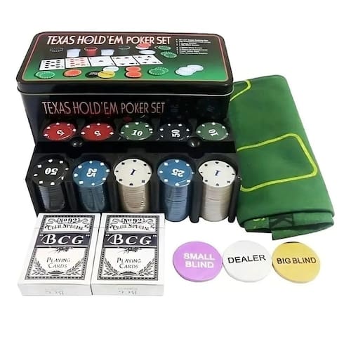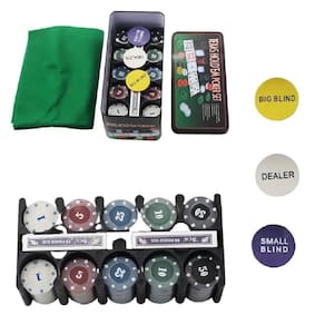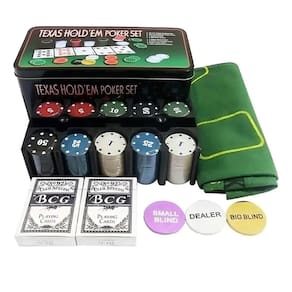Kit de Poker Profissional 200 Fichas Numeradas Completo!Reúna os amigos e a família e passe horas se divertindo com este maravilhoso jogo de poker de 200 peças. Ele possui uma linda maleta de luxo feita de metal, é um ótimo presente para todas as ocasiões. Você poderá jogar a qualquer hora e em qualquer lugar, basta estar com sua lata, que é fácil de transportar e guardar. Divirta-se muito com seus amigos com este jogo de Poker Profissional.Características:200 fichas de poker (40 azuis, 40 verdes, 40 brancas, 40 pretas e 40 vermelhas)1 botão Dealer, 1 botão Big Blind e 1 botão Small BlindMaleta de metal com acabamento de luxo2 - Baralhos1 - Feltro verde de veludo para mesa medidas 90 cm x 60 cm1 - Rack para encaixe das fichasFichas com 4 gramas cadaFichas confeccionadas em plástico ABS resistente.Medidas maleta de metal: 24 cm comprimento x 20 cm profundidade x 10 cm altura;Itens inclusos:200 x Fichas de poker (40 azuis, 40 verdes, 40 brancas, 40 pretas e 40 vermelhas)1 x Lata para acondicionamento2 x Baralhos1 x Rack para encaixe e armazenamento das fichas1 x Botão Dealer1 x Botão Big Blind1 x Botão Small BlindPeso: 2,5kg