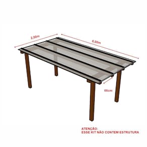 O kit não possui estrutura. Antes do uso as chapas devem ser armazenadas sobre uma superfície plana e protegidas de luz solar direta, chuva e ventoCurvatura a frio somente no sentido dos alvéolos Recomenda-se não furar a chapa devido ao grande coeficiente de dilatação do policarbonatoO filme de proteção indicando o lado do UV deve ficar para cima e precisa ser removido imediatamente após a instalação