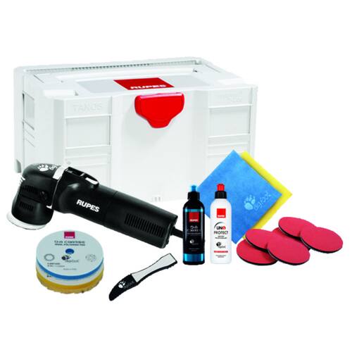Mini politriz Roto orbital livre Rupes LHR75E BOX - Kit composto por uma politriz Rupes roto orbital livre com prato de 75mm - 3", ideal para a correção de pintura e polimento em zonas pequenas ou estreitas.