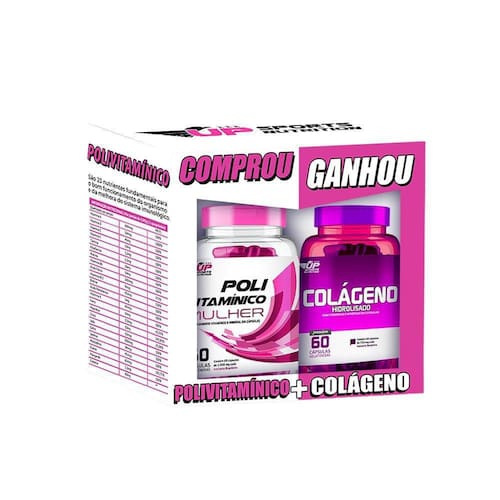 Kit Polivitamínico Mulher + Colágeno HidrolisadoO colágeno é a proteína mais abundante no organismo, constituindo cerca de 30% das proteínas do nosso corpo e 6% do nosso peso total. O colágeno tem função estrutural, ou seja, proporciona sustentação às células, impedindo a deformação dos tecidos. O colágeno faz parte da composição de órgãos de sustentação como a pele, os ossos, tendões e cartilagens. A partir dos 30 anos, o corpo sofre uma perda de colágeno por volta de 1% por ano, e aos 50, passa a produzir apenas uma média de 35% do colágeno necessário para os órgãos de sustentação. A deficiência de colágeno provoca flacidez muscular, fragilidade articular e óssea, diminui a espessura do fio capilar, promove a desidratação e perda de elasticidade da pele, acarretando em flacidez, rugas e estrias. O uso diário do Colágeno não tem contraindicação e é capaz de estimular a produção do colágeno natural. O colágeno hidrolisado em pó fornece aminoácidos fundamentais para a manutenção de ossos e a reconstituição ou regeneração de algumas articulações.BENEFÍCIOSÀ parte dos benefícios para a saúde, propriamente ditos, ainda há o valor estético que ele pode oferecer às pessoas que desejam eliminar a flacidez da pele, combater a queda de cabelos e fortalecer as unhas. Estrutura, fortalecimento da pele e elasticidade. Prevenção de rugas. Fortalecimento das articulações, óssos e cartilagens. Aumento do sistema imunológico. Fortalecimento de cabelos e unhas. Fundamental na síntese de colágeno. Previne escorbuto. POLI VITAMÍNICO MULHERPoli Vitamínico é um produto fabricado com uma família de nutrientes muito especiais - a das vitaminas e minerais. Esses elementos também são chamados de micronutrientes, indicando que as necessidades são pequenas quando comparadas aos nutrientes que fornecem energia, como carboidratos, proteínas e gorduras. No entanto, apesar de não necessitarmos de grandes quantidades, é comum encontrar pessoas que apresentam deficiência nutricional desses elementos.As vitaminas e os minerais são extremamente importantes para o nosso organismo, visto que atuam no funcionamento, crescimento, desenvolvimento e nas funções metabólicas. Um aporte adequado de vitaminas e sais minerais pode prevenir doenças cardiovasculares, neurodegenerativas e até alguns tipos de câncer.São 17 nutrientes fundamentais para o bom funcionamento do organismo, de modo que todos são encontrados em alimentos que podem ser consumidos no dia a dia. No entanto, com a correria da rotina, nem sempre é possível suprir a necessidade diária somente através da oferta alimentar.Dessa forma, os suplementos poli vitamínicos tornam-se uma ferramenta muito importante para praticantes de atividade física, atletas e sedentários, que podem consumir os nutrientes necessários à saúde e melhorar o desempenho esportivo.BENEFÍCIOSO uso de polivitamínicos associado à prática regular de atividade física combate o estresse causado pelos radicais livres no organismo, moléculas que retardam os ganhos e levam ao envelhecimento precoce das células. Além disso, quem suplementa polivitamínico tende a ter mais energia durante a atividade física e recuperação muscular acelerada.Além disso, exercícios de longa duração tendem a esgotar o estoque de sais minerais e consumir mais rapidamente as vitaminas armazenadas no organismo, por isso, o polivitamínico é aliado dos praticantes de exercícios físicos, suprindo as exigências nutricionais dos treinos. Melhora a memória. Reduz o estresse. Diminui a sensação de cansaço. Torna a digestão mais eficaz. Auxilia no crescimento muscular. Diminui as dores durante o exercício.Produto Isento de registro conforme RDC 27/2010