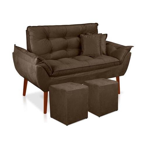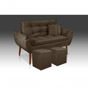 Kit Poltrona Decorativa Namoradeira 2 Puffs Quadrado e 2 Almofadas Suede Marrom - LM Decor