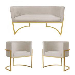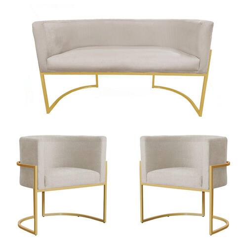 Kit Poltrona e Namoradeira Luana Base Metálica Dourada Suede Bege - Vallisa Decor
