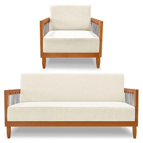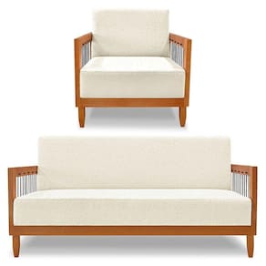 Kit Poltrona E Sofá Living 2 Lugares Marilia 1,60m Linho Natural Base Em Madeira Castanho - Pallazio