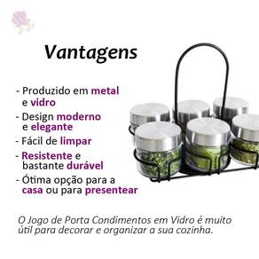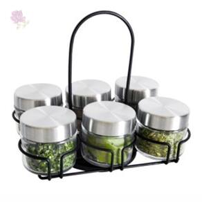 Kit porta condimentos em vidro com tampa e suporte em metal jogo de porta condimentos em vidro com tampa prata e suporte em metal preto 6 peças - casambiente