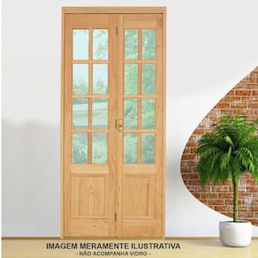 Porta sanfonada de madeira maciça (cotovelo), possui 4 dobradiças estilo camarão, uma cremona de embutir no acabamento em ouro velho, trilho de alumínio e um puxador de 19 cm. O vidro pode ser quadriculado ou liso. Acompanha guarnição (vistas) 6 cm PARA UM LADO. O tom da madeira pode variar, por se tratar de um produto marroml. A matéria prima (madeira) passa por um processo de secagem de 18 meses, incluindo secagem em estufa, os produtos saem da fábrica com lixamento pronto para pintura ou aplicação de selador e verniz. Peso por Caixa: 48Kg Ambientes Recomendados: Interno Espécie: Eucalipto Acabamento do Puxador: Ouro velho Acompanha Batedor: Não Acompanha Batente: Sim Acompanha Dobradiça: 04 Acompanha Fechadura: Sim Acompanha Grade: Não Acompanha Guarnição: Sim Acompanha Manual de Instalação: Sim Acompanha Puxador: 01 Acompanha Trinco: Não Altura: 213 cm codigo_ean: 7899932108808 Cor: Marroml Cor: Marroml Cor do Produto: Marroml Cor Predominante: Marroml Escala de Brilho: Fosco Espessura: 12 cm Indicações de Uso: Kit Itens Inclusos: 1 Kit Porta de Madeira. JE221 1000X1000X120 VL CMA: PE71 1100X2130X120 VQ EUC D JE221000192: PE71000031 Lado de abertura: Direita Largura: 110 cm Largura do Batente: 12 cm Material da Dobradiça: Aço Material do Batente: Madeira Material do Puxador: Alumínio Material Principal: Madeira Necessita Instalação: Não Necessita Montagem: Não Número de Folhas: 02 Peso: 36 kg Possui Grade: Não Possui Vidro: Não Preenchimento da Porta: Maciça Quantidade de Folhas: 02 Recomendações de Uso, Manutenção e Limpeza: Seguir manual. Tamanho: 213cm x 110cm Textura da Porta: Com detalhe vidro Tipo de Dobradiça: Camarão Tipo de Madeira: Eucalipto Tipo de Porta: Camarão Tipo de Puxador: Externo Vidro incluso: Não Ean: 7899932108808