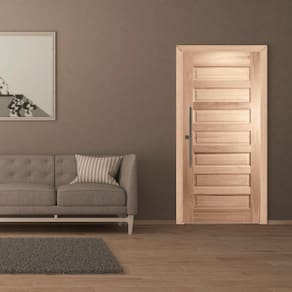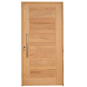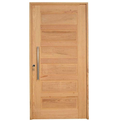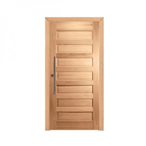 Porta de madeira maciça com dobradiça modelo pivotante com acabamento em inox, uma fechadura fecho rolete e puxador chato de 60 cm. Lembrando que essa porta em virtude de ser pivotante o vão de passagem se reduz, pois, a dobradiça pivotante não fica rente ao batente e sim avança em torno de 10 cm para dentro da porta. Acompanha guarnição (vistas) 6 cm PARA UM LADO. O tom da madeira pode variar, por se tratar de um produto marroml. A matéria prima (madeira) passa por um processo de secagem de 18 meses, incluindo secagem em estufa, os produtos saem da fábrica com lixamento pronto para pintura ou aplicação de selador e verniz.
