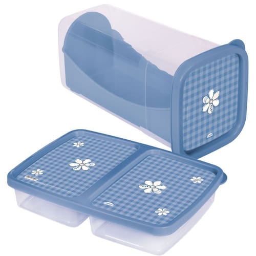 Conjunto com 1 porta frios plástico de 2 divisórias com tampa, e 1 porta biscoitos e torradas com gaveta deslizante plástico.