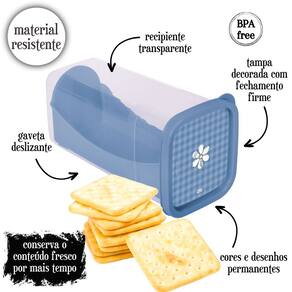 Porta Torradas/Biscoito com Gaveta Deslizante e tampa decorada Material: Polipropileno Dimensões: 21,7cm X 10,5cm X 12cm (CxLxA)