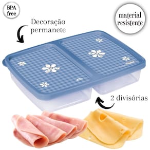 Porta Frios Transparente com 2 Divisórias e tampa decorada Material: Polipropileno Dimensões: 24,2cm X 17,5cm X 4,8cm (CxLxA)