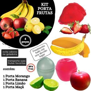 Kit de potes para guardar / armazenar alimentos na geladeira ou armário. É composto por 1 porta banana (C:22,0 x L:11,5 x A:5,1 cm), 1 porta morango (C:11,8 x L:14,0 x A:8,0 cm), porta maça (C:11,2 x L:10,5 x A:10,5 cm) e 1 porta limão (C:8,3 x L:8,3 x A:10,5 cm). Todos os potes são fabricados em polipropileno e não contém Bisfenol A (BPA Free). Podem ser levados ao freezer e ao micro-ondas. - Evita cheiro desagradável na geladeira; - Conserva os alimentos já cortados por mais tempo; - Evita o ressecamento precoce do produto armazenado; - Fechamento de encaixe; - Peças em formato sugestivo de cada alimento; Fabricante: Plasutil.