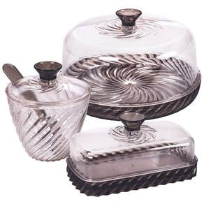 Kit para café da manhã / chá da tarde composto por 1 queijeira / porta queijo (C:18,0 x L:18,0 x A:10,5 cm), 1 manteigueira / porta manteiga (C:15,2 x L:8,8 x A:7,4 cm) e 1 açucareiro / porta açúcar com colher (C:11,5 x L:11,1 x A:9,8 cm). São fabricados em poliestireno (idêntico ao acrílico) e parecem vidro. São leves e resistentes. Todos os produtos são na cor preta e se combinam.Atenção:- Não pode ser levado ao micro-ondas;- Não pode ser lavado na lava-louças;- Sugerimos que a lavagem seja feita com o lado macio da esponja.Fabricante: Plasutil