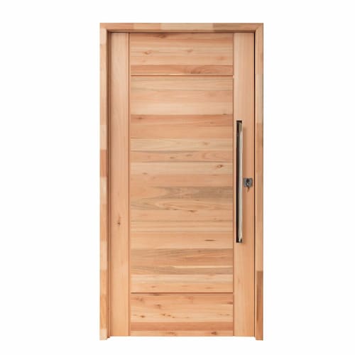 A Porta Pivotante Pv95 Comercial Clean Eucalipto Natural da Cruzeiro possui design com duas linhas verticais na borda e diversas linhas horizontais ao longo do corpo. É produzida em madeira Eucalipto com nós tipo Grandis 100% Reflorestada.