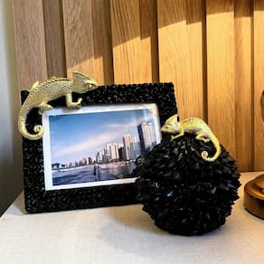 Transforme seu ambiente com o charme e a sofisticação do nosso conjunto exclusivo, composto por um potiche preto com camaleão dourado e um porta-retrato preto em resina com camaleão dourado. Peças que combinam arte e funcionalidade, perfeitas para enriquecer qualquer decoração com estilo e personalidade.