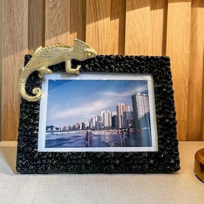 Design Único e Sofisticado: Porta-retrato em resina preta com um camaleão dourado, criando um contraste encantador. Material de Alta Qualidade: Feito em resina durável, garantindo resistência e um acabamento refinado. Medidas e Peso: Altura 19cm, Largura 22cm, Profundidade 9cm, Peso 505g. Para foto 13x18cm