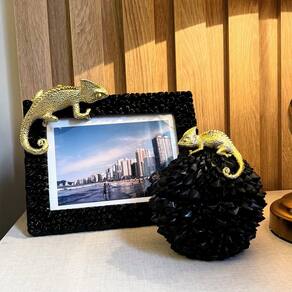 Transforme seu ambiente com o charme e a sofisticação do nosso conjunto exclusivo, composto por um potiche preto com camaleão dourado e um porta-retrato preto em resina com camaleão dourado. Peças que combinam arte e funcionalidade, perfeitas para enriquecer qualquer decoração com estilo e personalidade.