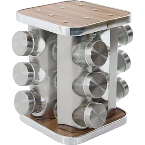 Com o kit porta temperos e condimentos com 12 potes e suporte giratório você terá qualidade e refinamento na aparência da sua cozinha e na apresentação das suas receitas. O acabamento em brilho cromado proporciona sofisticação para os serviços completos para mesa.
