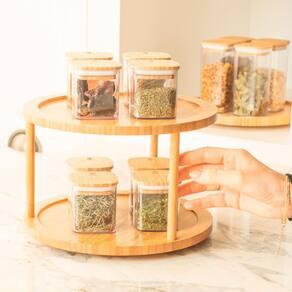 01 - Organizador Giratório Keep Bambu 25 x 25 x 2,5 cm : Sistema giratório de 360 para organizar e facilitar o acesso aos itens, perfeito para quem busca uma rotina mais prática e organizada.