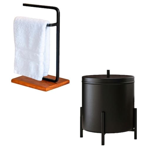 Kit Porta Toalha Bancada E Lixeira 6L Lovell Banheiro Cozinha DHom da linha level é perfeito para complementar o seu ambiente e dar um toque de elegância. O kit conta com estrutura em aço maciço, pintura eletrostática (epóxi) e acabamento em preto fosco. Porta toalha duplo de bancada para manter a toalha de rosto sempre ao alcance e base em madeira. A lixeira é em alumínio e se encaixa na sua base maciça evitando contato com o chão, capacidade de 6 Litros. É ideal para banheiro, cozinha, lavanderia, salão de beleza entre outros. Estes móveis chegarão em sua casa separados em 2 volumes.