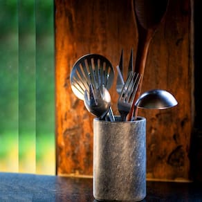 Produzido em pedra sabão, o porta utensílio também pode ser usado como vaso de plantas ou como porta vinho. Uma peça especial por sua capacidade térmica, de manter a temperatura. Ideal para guardar vinho, uso decorativo com plantas e flores ou até mesmo a organização dos seus talheres na cozinha, perfeito para deixar a decoração do ambiente sofisticada e com um toque de charme. Limpeza e Cuidados: A limpeza das peças é fácil e prática. É recomendado utilizar um pano úmido macio ou espanador de pó. Não utilizar produtos químicos ou corrosivos.