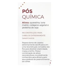 Kit Pós Química Vita Derm 1 Shampoo 300ml 1 Condicionador 300ml 1 Máscara 220g 1 Leave In 140ml Shampoo: Com os cabelos molhados, distribua com as mãos o produto por todo o couro cabeludo e comprimento dos fios. Massageie até obter uma espuma cremosa. Depois, enxague ate retirar completamente o produto dos fios. Se necessário, repita os passos para uma segunda lavagem. Condicionador: Após a lavagem, retire o excesso de água e aplique o produto ao longo dos fios do meio para as pontas. Não aplique o produto na raiz para evitar oleosidade. Massageie e desembarace com o auxílio dos dedos ou do pente. Deixe agir por um minuto e enxágue. Máscara: Aplique a máscara ao longo dos fios úmidos enluvando mecha a mecha. Não aplique a máscara na raiz para evitar oleosidade. Deixe agir de 5 a 10 minutos e enxágue. Deve ser uma vez por semana. O Leave-in Vita Derm Fluído Reestruturante Pós Química Após higienizar e hidratar, borrife ao longo dos fios úmidos, do meio para as pontas, evitando a raiz. Não é necessário enxaguar. Você também pode usar com os cabelos secos e sem finalização de calor. Nossos Experts Ensinam Para garantir atingir o resultado desejado, mantenha o tratamento com a linha completa para potencializar seus agentes. Marca: Não Informado