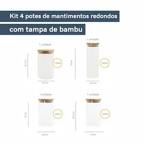 Esse conjunto contém 4 peças: 1 unidade - POTE 450ML DE VIDRO COM TAMPA DE BAMBU CIRCULAR MANTIMENTO - OIKOS Diâmetro: 6,5cm / Altura: 18cm 1 unidade - POTE 600ML DE VIDRO COM TAMPA DE BAMBU CIRCULAR MANTIMENTO - OIKOS Diâmetro: 8,5cm / Altura: 15cm 1 unidade – POTE 1100ML DE VIDRO COM TAMPA DE BAMBU CIRCULAR MANTIMENTO - OIKOS Diâmetro: 9,5cm / Altura: 19cm 1 unidade - POTE 1650ML DE VIDRO COM TAMPA DE BAMBU CIRCULAR MANTIMENTO - OIKOS Diâmetro: 10cm / Altura: 24cm