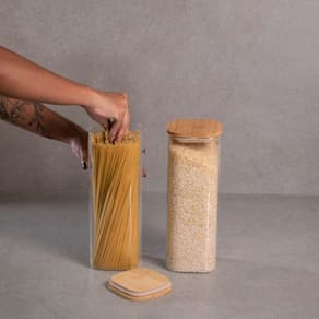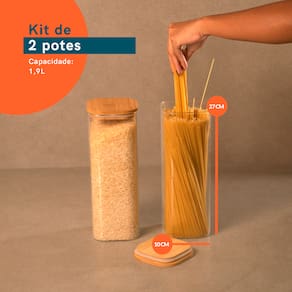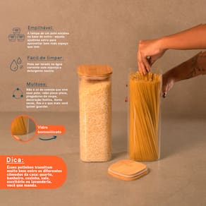Esse é o KIT DE POTE HERMÉTICO DE VIDRO QUADRADO COM TAMPA DE BAMBU 2 PEÇAS - OIKOSEsse Kit contém:2 POTES 1,9L DE VIDRO FLAT COM TAMPA DE BAMBU QUADRADO MANTIMENTO – OIKOSEsses são os potes de mantimentos quadrado flat com tampa de bambu da OIKOS. Cabe em qualquer lugar: seu formato quadrado ajuda a aproveitar melhor o espaço - ele encaixa direitinho no canto do armário. Tampa hermética: sua tampa possui um anel de vedação de silicone que veda de verdade! Tampa flat: uma tampa de bambu retinha, fácil de limpar e que fica uma graça na cozinha ;) Mestre da na conservação: a combinação da vedação de silicone com o bambu antibacteriano garante melhor conservação dos alimentos que duram por muito mais tempo. Versátil: não é só de comida que vive esse pote: pisca-pisca, pregadores de roupa, decoração de Natal, nozes, flores secas, fios, jogos e o que mais você quiser guardar - isso que é versatilidade.