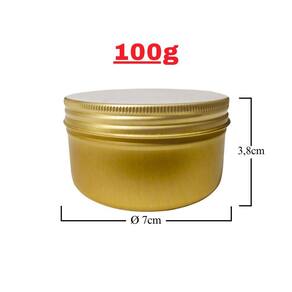 Ficha técnica: Material: alumínio de alta qualidade Capacidade: 100g Dimensões: altura de 3,8cm com um diâmetro de 7cm Cor: dourado Fechamento: tampa rosqueável para vedação segura Reciclabilidade: 100% reciclável, contribuindo para a sustentabilidade ambiental