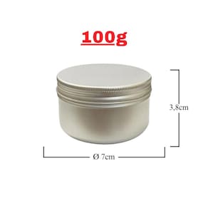 Ficha técnica: Material: alumínio de alta qualidade Capacidade: 100g Dimensões: altura de 3,8 cm com um diâmetro de 7cm Cor: prata Fechamento: tampa rosqueável para vedação segura Reciclabilidade: 100% reciclável, contribuindo para a sustentabilidade ambiental