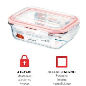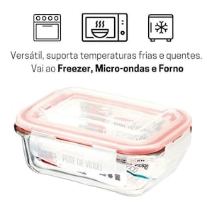 Kit Potes De Vidro Herméticos 2 Peças Retangular 640ml O Kit Potes de Vidro 2 Peças Retangular contém dois potes com capacidade 640ml.Eles contam com uma camada de vidro grossa compacta, trazendo segurança e firmeza no momento de utilizar, são potes herméticos que suportam temperaturas baixas e altas, mantendo a mesma qualidade do seu alimento, deixando o frescor da comida presente por mais tempo. Conta com 4 travas, que anulam qualquer possíveis vazamentos. Ideal para armazenar alimentos na geladeira ou no congelador. Cor - Transparente- Anel de Silicone Vermelho Características - Suportam temperaturas baixas e altas- Vai ao forno convencional Sem a tampa - Microondas Sem a tampa - Forno elétrico Sem a tampa - 100% Livre de BPA, não libera substâncias tóxicas na comida.- Silicone removível Auxilia na hora da limpeza - Possuí 4 travas Devido à super vedação não oferece riscos de vazamento - Base de vidro não mancha, nem fica com cheiro dos alimentos Dimensões - Altura: 7cm- Largura: 13cm- Comprimento: 18cm CUIDADOS - ATENÇÃO; tampa não vai ao microondas- Utilize sabão neutro e espoja macia para higienizar- Não utilizar materiais abrasivos na limpeza