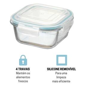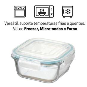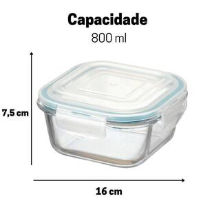 Kit Potes De Vidro Herméticos 4 Peças Quadrado 800ml O Kit Potes De Vidro Herméticos 4 Peças Quadrado contém quatro potes de vidro herméticos com capacidade 800ml Eles contam com uma camada de vidro grossa compacta, trazendo segurança e firmeza no momento de utilizar, são potes herméticos, suportam temperaturas baixas e altas, mantendo a mesma qualidade do seu alimento, deixando o frescor da comida presente por mais tempo. Conta com 4 travas herméticas, que anulam qualquer possíveis vazamentos. Ideais para armazenar alimentos na geladeira ou no congelador. Cor - Transparente - Anel de Silicone Azul Características - Suportam temperaturas baixas e altas - Vai ao forno convencional Sem a tampa - Microondas Sem a tampa - Forno elétrico Sem a tampa - 100% Livre de BPA, não libera substâncias tóxicas na comida. - Silicone removível Auxilia na hora da limpeza - Possuí 4 travas Devido à super vedação não oferece riscos de vazamento - Base de vidro não mancha, nem fica com cheiro dos alimentos Dimensões - Altura: 7,5cm - Largura: 16cm -comprimento: 16cm CUIDADOS - ATENÇÃO; tampa não vai ao microondas - Utilize sabão neutro e espoja macia para higienizar - Não utilizar materiais abrasivos na limpeza