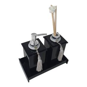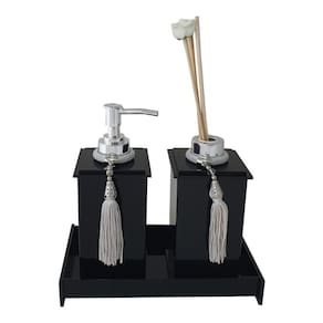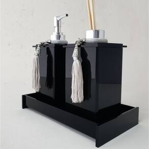 Kit Potes Em Acrílico Para Banheiro 3 Pçs Luxo K15PT1 Este Kit contém: 1 bandeja acrílica pequena retangularmulti uso tamanho 20cm x 11cm x 3cm (altura) 1 difusor de ambiente com pingente. medidas- 7 cm x 7cm x 14 cm (altura) 1 saboneteira liquida com válvula ABS cromada e pingente decorativo. Medidas – 7cm x 7cm x 18cm (altura) Mais detalhes sobre o produto: Bandeja: Excelente produto multiuso para seus acessórios. Também serve como porta objetos, porta difusores de vidro, maquiagens, porta copos, organizador de gavetas e outros... O acrílico é um produto resistente, atóxico e fácil de lavar. Basta água corrente e sabão neutro. Não muda de cor com o passar do tempo. 1 saboneteira liquida em acrílico com válvula abs cromada e pingente decorativo. Possui frasco interno fácil de higienizar em pet com capacidade para 200ml de sabonete líquido. Medidas – 7cm x 7cm x 18cm 1 difusor de ambiente com pingente decorativo e frasco para 200ml de essência do seu gosto (não acompanha). Você pode adquirir as essências aqui em nossa loja também. (amadeirado, alecrim ou romã com lichia – todos 200mL) . Acompanha conjunto de varetas (4 varetas + 1 vareta decorativa) Maravilhoso conjunto 3 peças na cor Preto. Tudo o que o seu banheiro precisa com muita classe, estilo e praticidade. O acrílico é um produto resistente, atóxico e fácil de lavar. Basta água corrente e sabão neutro. Não muda de cor com o passar do tempo. Que tal uma bancada organizada, com cada coisa em seu devido lugar? Tudo com muita praticidade e muito estilo ? Conheça a nossa linha de acessórios para banheiros. Tudo confeccionado com acrílico cast de primeira qualidade. Altamente durável. Nosso material é atóxico, não possui cheiro e não muda de cor com o passar do tempo. Garantia: 3 meses