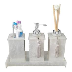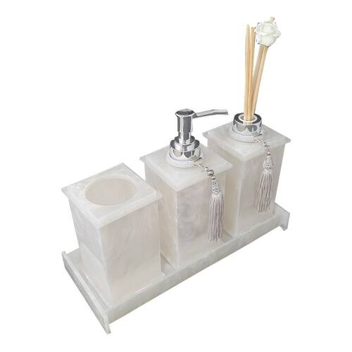 Kit Potes Em Acrílico Para Banheiro 4 Pçs Luxo K15PE4 Este Kit contém: 1 Bandeja Acrílica Pequena Retangularmulti uso tamanho 20cm x 11cm x 3cm. 1 Pote vazadomulti-uso. Medidas 7cm x 7cm x 13 cm (Tampa com orifício raio 5,5cm ) 1 difusor de ambiente. medidas do difusor - 7 cm x 7cm x 14 cm 1 Saboneteira Liquida em Acrílico com Válvula ABS Cromada e Pingente Decorativo. Possui frasco interno fácil de higienizar em pet com capacidade para 200ml de sabonete líquido. Medidas – 7cm x 7cm x 18cm (altura) Mais detalhes sobre o produto: Bandeja: Excelente produto multiuso para seus acessórios. Também serve como porta objetos, porta difusores de vidro, maquiagens, porta copos, organizador de gavetas e outros... O acrílico é um produto resistente, atóxico e fácil de lavar. Basta água corrente e sabão neutro. Não muda de cor com o passar do tempo. Pote vazadomulti-uso: Pode ser utilizado como porta escova de dente , porta escova de cabelo, pentes, pincéis de maquiagem além de outros. Difusor de Ambiente com Pingente decorativo e frasco para 200ml de essência do seu gosto (não acompanha). Você pode adquirir as essências aqui em nossa loja também. (amadeirado, alecrim ou romã com lichia – todos 200mL) . Acompanha conjunto de varetas (4 varetas + 1 vareta decorativa) Maravilhoso conjunto 4 peças na cor pérola. Tudo o que o seu banheiro precisa com muita classe, estilo e praticidade. O acrílico é um produto resistente, atóxico e fácil de lavar. Basta água corrente e sabão neutro. Não muda de cor com o passar do tempo. Que tal uma bancada organizada, com cada coisa em seu devido lugar? Tudo com muita praticidade e muito estilo ? Conheça a nossa linha de acessórios para banheiros. Tudo confeccionado com acrílico cast de primeira qualidade. Altamente durável. Nosso material é atóxico, não possui cheiro e não muda de cor com o passar do tempo. Garantia: 3 meses