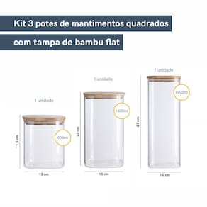 Esse conjunto contém 6 peças: 1 unidade - POTE DE MANTIMENTOS QUADRADO FLAT 800ML TAMPA BAMBU - OIKOS Comprimento: 10 / Largura: 10 / Altura: 11,5