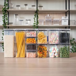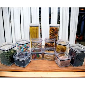 Este conjunto com 12 potes quadrados herméticos é ideal para conservar os alimentos e deixar sua cozinha mais bonita e organizada. Este modelo é empilhável, permitindo que você compre quantas unidades desejar sem ocupar muito espaço no seu armário. O sistema de vedação é perfeito. Mantém os alimentos frescos por muito mais tempo. Ideal para guardar bolachas, biscoitos, massas, doces, salgadinhos, nozes, cereais, grãos e etc. É prático, fácil de abrir e fechar, fácil de limpar e ainda decora o ambiente.