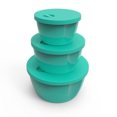 O conjunto de Potes Redondos da Linha Cor e Arte está disponível em 03 tamanhos, com capacidade para 350ml, 650ml e 1200ml.