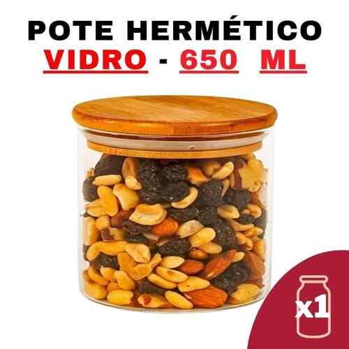 Especificações técnicas: - Marca: Senhora Madeira - Modelo: Hermético Tampa em Bambu - Material: Tampa em bambu e vidro - Dimensões: 6,5cm de largura x 6,5cm de altura - Capacidade: 650ml