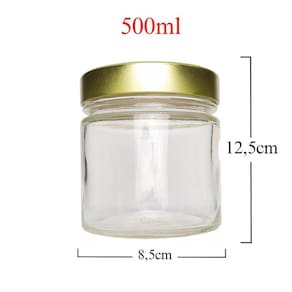 Medidas: - capacidade: 500ml - altura: 12,5 cm - diâmetro: 8,5 cm - peso: 237g - material: pote de vidro e tampa de metal.