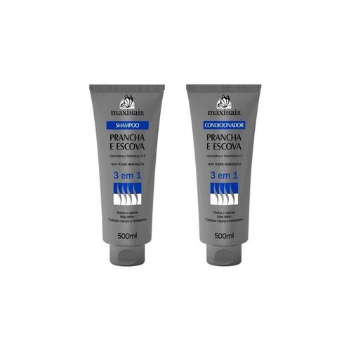Esse kit contém: 1 Shampoo Maxihair 500ml Prancha e Escova 3 em 1 e 1 Condicionador Maxihair 500ml Prancha e Escova 3 em 1.