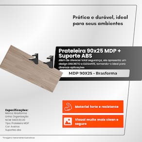 Este kit completo da Brasforma combina uma prateleira de MDP com acabamento em UV e suportes de ABS de ALTA RESISTÊNCIA. Além de oferecer total segurança, ele apresenta um design DISCRETO e ELEGANTE, tornando-o ideal para diversas aplicações. Com todos os acessórios de fixação incluídos, a INSTALAÇÃO É RÁPIDA E FÁCIL, permitindo que você transforme qualquer ambiente. Esta combinação além de garantir maior firmeza estrutural, torna a prateleira mais resistente ao empenamento e a colocação e remoção de parafusos, além de torná-lo um material mais leve. Design discreto e elegante permite uma fácil instalação, pois já acompanha todos os acessórios para fixação podendo ser instalado em diversos ambientes.