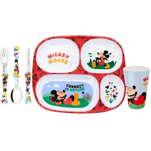 Incluso Copo Melamina Mickey 300ml e jogo de talheres em aço inox!