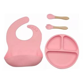 Kit Prato Ventosa Babador Colher e Garfo Infantil Silicone Cor: Rosa Kit Prato Ventosa Babador Colher e Garfo Infantil Silicone