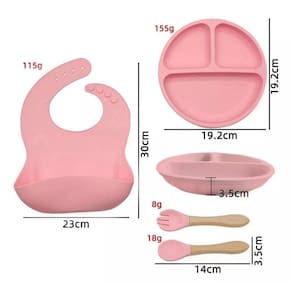 Dimensões: Babador: 22x33cm Prato com ventosas: 19,50x19,5x3cm Colher: 13,5x3 cm Garfo: 13,5x3 cm