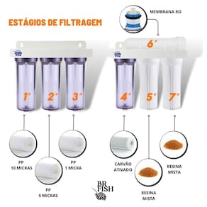 Kit com 3 carcaças transparentes, suporte triplo, conectores, 3 refis de polipropileno (10, 5 e 1 micra), cartucho recarregável e resina mista mb400 de 500g. Inclui mangueiras para instalação.Estágios de filtragem
